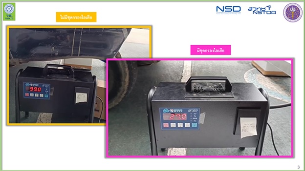 Dr. Pornanong further presented the performance of this device when tested with a diesel pickup truck. At the maximum speed, the level of black smoke emissions was 99%. With the ESP device, the emissions level went down to 27%, meeting the new emission standard capped at 30%.