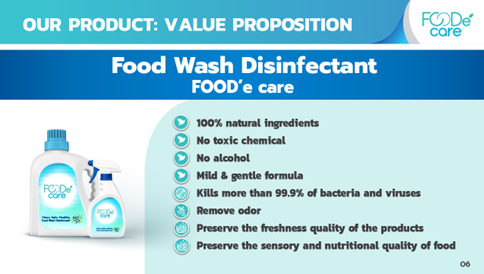 ENcase converts sodium chloride (NaCI) as a precursor to electrolyzed water via the electrolysis. Electrolyzed water contains hypochlorous acid (HOCl) which acts as a disinfection agent. The research team then explored the application of hypochlorous acid as a food wash. A suitable formula was achieved to create FOODe’ care food wash that can effectively remove chemical residues and pathogens – bacteria, viruses, and fungi, including their spores – from fresh food including fruits, vegetables, and meat. Cleaning with water can remove only 25% of chemical residues present, whereas household products such as baking soda, vinegar, or potassium permanganate can improve the performance to 40-67% but can also compromise taste and color.