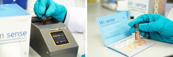 Dr. Kantapat Chansaenpak, member of NANOTEC Responsive Nanomaterials Research Team, explained that Mn Sense is a simple, rapid and highly sensitive detection test of manganese ions based on colorimetric detection. The research team designed a reagent containing a molecular sensor that reacts with manganese ions causing a color switching from colorless to brownish orange. Semi-qualitative results can be obtained by visual determination and comparison with a color chart, whereas qualitative measurement is achieved with DuoEye reader, a portable colorimeter developed by NECTEC-NSTDA. Data from DuoEye can be transmitted and stored in the cloud via a Wi-Fi connection for future access and analysis.