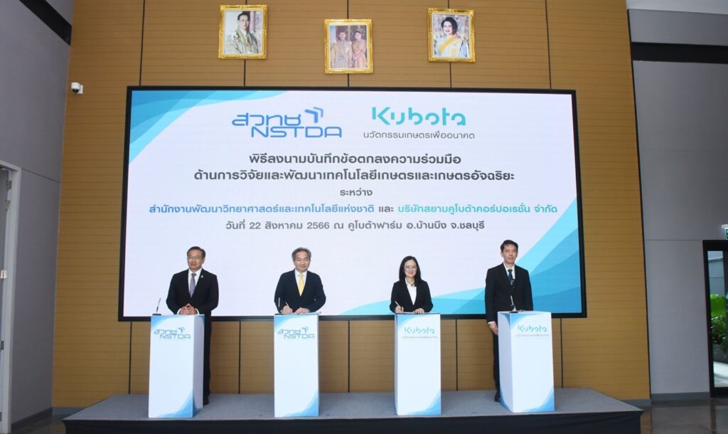 NSTDA and Siam Kubota Corporation recently formed a partnership to foster agricultural technology and smart farming solutions. Representing NSTDA and Siam Kubota Corporation at the agreement signing ceremony were NSTDA President Prof. Dr. Sukit Limpijumnong and Siam Kubota Corporation Senior Executive Vice President Ms. Waraporn Osathapan.