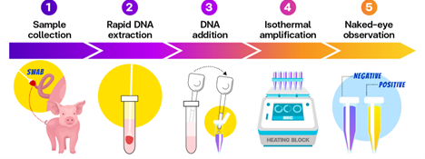 Mr. Rapheephat Suvannakad, a member of the research team, highlighted lower costs and a shorter assay time as the key advantages of PigXY-AMP over the real-time PCR test. The test takes only 70 minutes to obtain the result and does not require expensive scientific equipment and an expert to perform the test and interpret the result, making it suitable for field applications.
