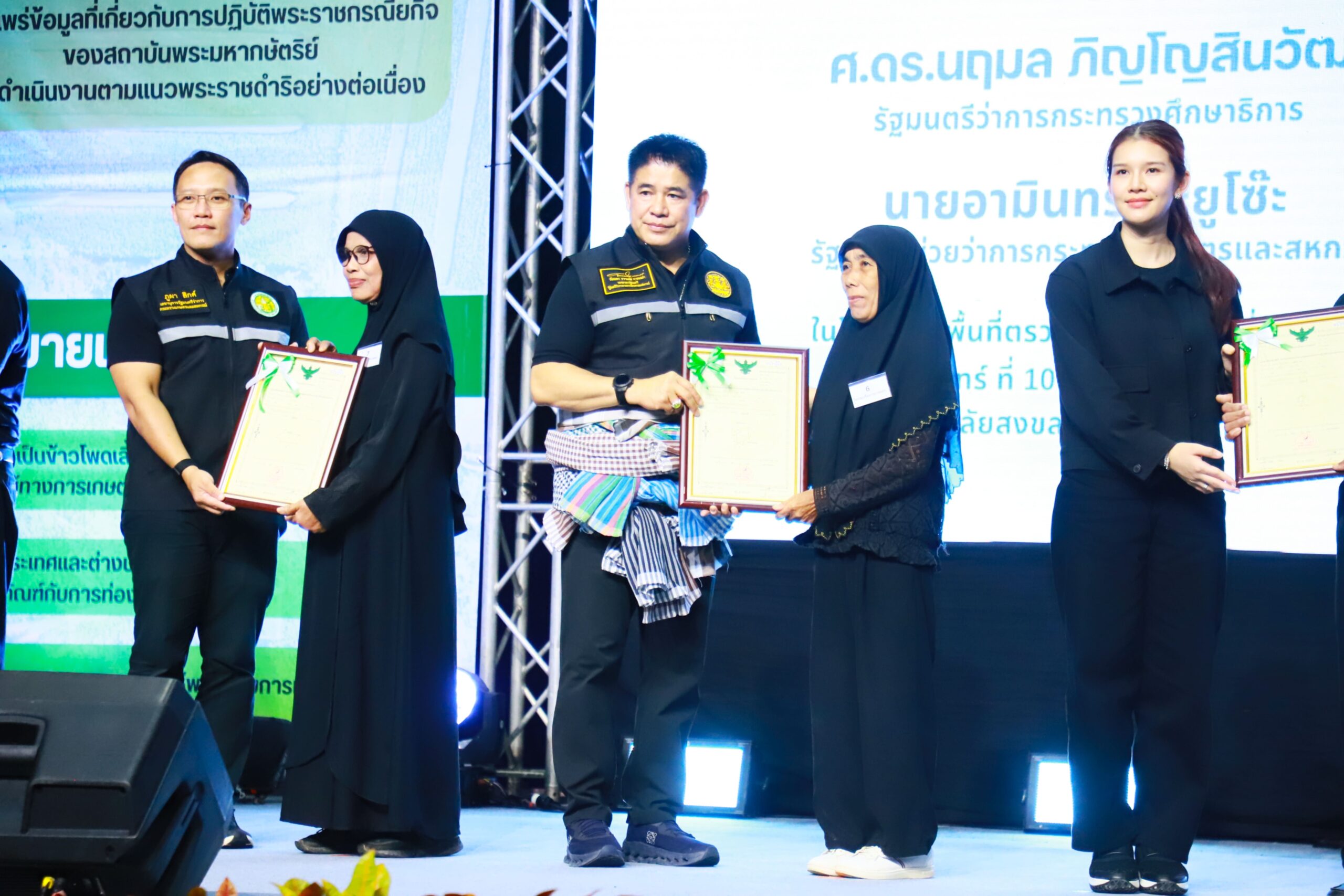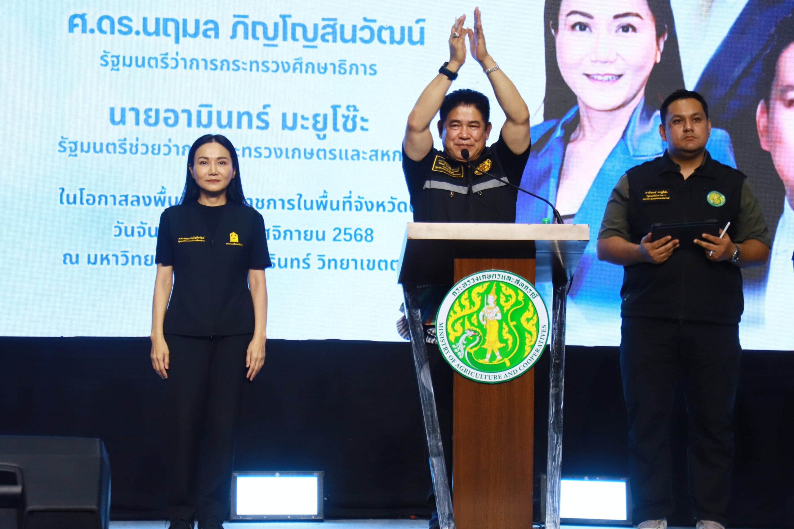 เมื่อวันที่10 พ.ย. 68 ที่ศูนย์ประชุมเฉลิมพระเกียรติ 7 รอบ พระชนมพรรษา มหาวิทยาลัยสงขลานครินทร์ วิทยาเขตตรัง ร้อยเอก ธรรมนัส พรหมเผ่า รองนายกรัฐมนตรี และรัฐมนตรีว่าการกระทรวงเกษตรและสหกรณ์ พร้อมด้วย ศ.ดร.นฤมล ภิญโญสินวัฒน์ รัฐมนตรีว่าการกระทรวงศึกษาธิการ นายอามินทร์ มะยูโซ๊ะ รัฐมนตรีช่วยว่าการกระทรวงเกษตรและสหกรณ์ และคณะ ลงพื้นที่จังหวัดตรัง เพื่อรับฟังการบรรยายการบริหารจัดการน้ำ ปัญหาการเกษตรในพื้นที่ มอบโฉนดที่ดินทำกินและปัจจัยการผลิตให้แก่เกษตรกร รวมถึงเยี่ยมชมนิทรรศการเกษตรมูลค่าสูง ด้านรัฐมนตรีว่าการกระทรวงศึกษาธิการ เข้าพบปะผู้บริหาร และบุคลากรทางการศึกษา เยี่ยมชมนิทรรศการผลงานนักเรียน เยี่ยมชมศูนย์ซ่อมสร้างเพื่อชุมช (Fix It Center) และเยี่ยมชม การฝึกวิชาชีพระยะสั้น โดยมี นายทรงกลด สว่างวงศ์ ผู้ว่าราชการจังหวัดตรัง พร้อมด้วย หัวหน้าส่วนราชการ หน่วยงานที่เกี่ยวข้อง และประชาชนในพื้นจำนวนมาก ให้การต้อนรับ