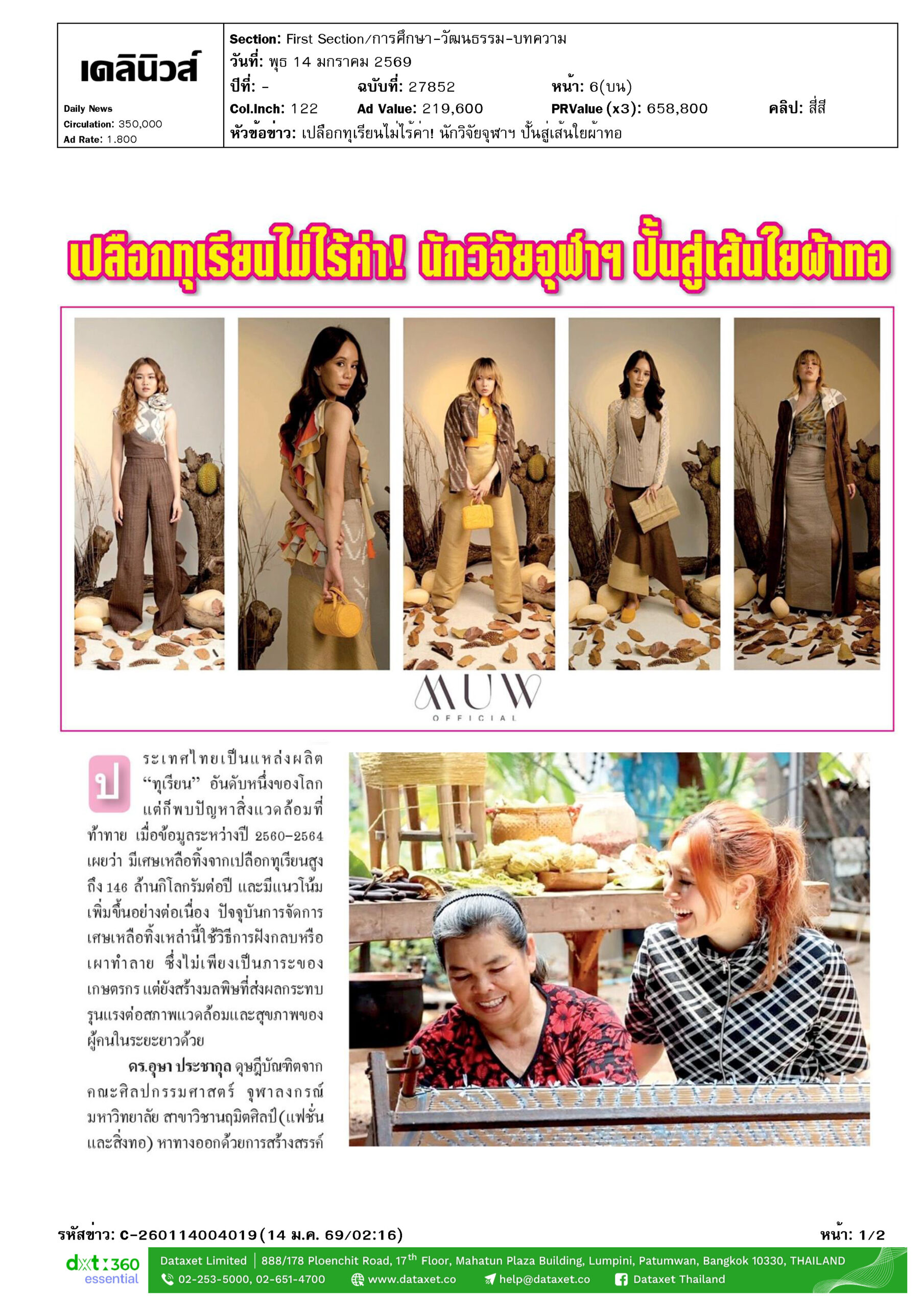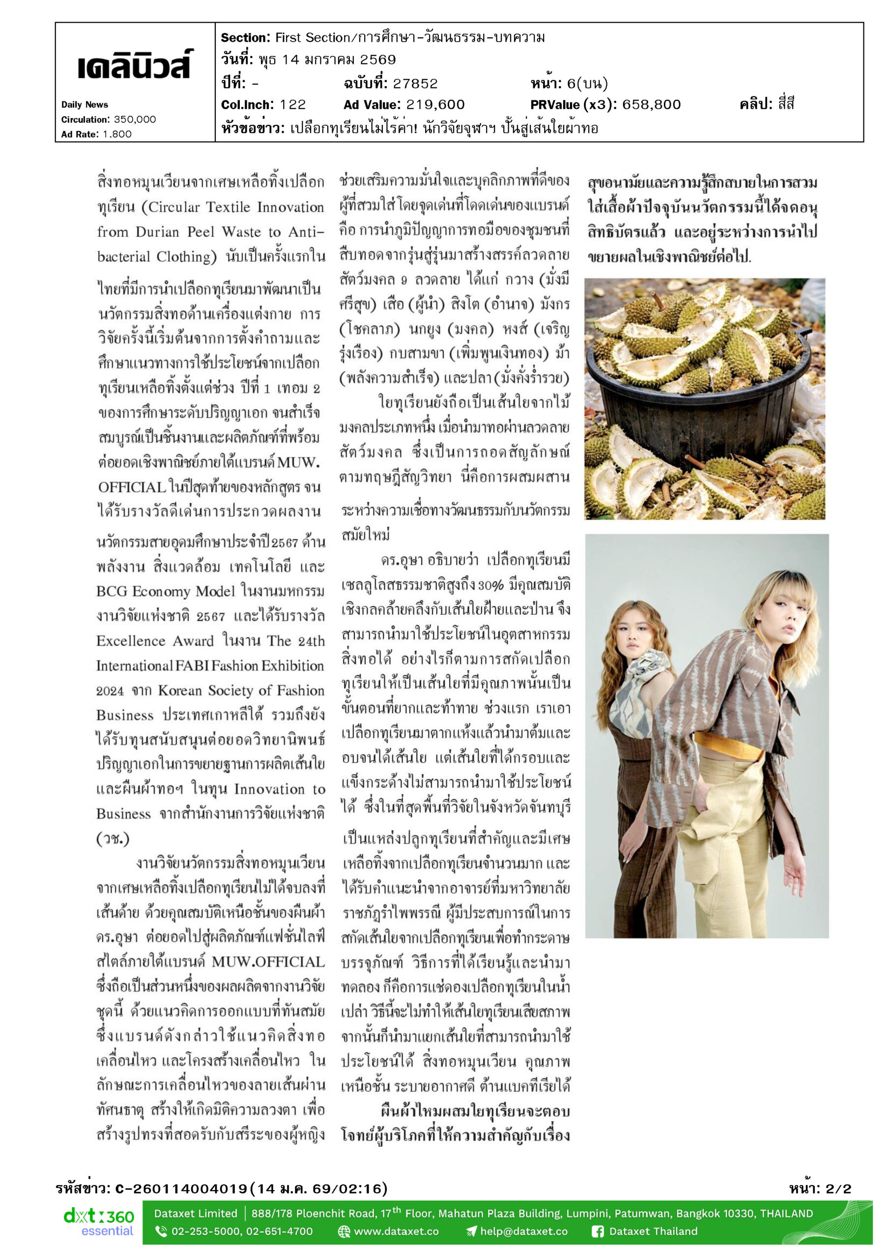 นวัตกรรม “สิ่งทอหมุนเวียนจากเศษเหลือทิ้งเปลือกทุเรียน” ได้รับรางวัล BCG Economy Model ในงานมหกรรมงานวิจัยแห่งชาติ 2567 และได้รับทุนสนับสนุนในทุน Innovation to Business จาก วช.