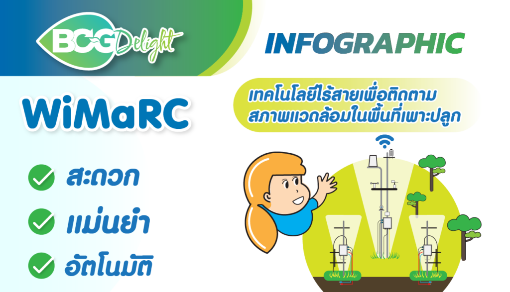 “WiMaRC” หรือ “ไวมาก” คือ เทคโนโลยีไร้สายเพื่อติดตามสภาพแวดล้อมที่ส่งผลต่อการทำการเกษตรในพื้นที่เพาะปลูกแบบเรียลไทม์ เพื่อให้เกษตรกรสามารถตรวจสอบข้อมูล วางแผนการเพาะปลูก และสั่งการทำงานอุปกรณ์ IoT ในพื้นที่ให้สอดคล้องกับสภาพแวดล้อมได้ง่ายๆ จากทุกที่ ทุกเวลา ผ่านเว็บแอปพลิเคชัน “WiMaRC” ติดตามสภาพแวดล้อมในพื้นที่เพาะปลูกด้วย 8 เซนเซอร์ สำหรับตรวจวัดความเข้มแสง ความชื้นอากาศ อุณหภูมิอากาศ ทิศทางลม ความเร็วลม ปริมาณน้ำ ฝน ความชื้นดิน และอุณหภูมิดิน ทำงานควบคู่กับ Webcam ที่ทำหน้าที่เก็บภาพเปรียบเทียบการเจริญเติบโตสำหรับใช้วิเคราะห์และบริหารจัดการแปลง เทคโนโลยีนี้มีจุดเด่นในเรื่องความสะดวกสบายในการใช้งาน ผู้ใช้งานสามารถตรวจสอบสภาพแวดล้อมของพื้นที่เพาะปลูกได้จากทุกที่ ทุกเวลา ผ่านเว็บแอปพลิเคชัน ควบคุมและสั่งการอุปกรณ์ IoT ได้จากทางไกล สามารถนำฐานข้อมูลมาพัฒนาและวางแผนการทำเกษตรแม่นยำ และประยุกต์ใช้งานได้กับหลายพื้นที่ ปัจจุบันทีมวิจัยพร้อมถ่ายทอดเทคโนโลยีให้แก่ผู้ที่สนใจแล้ว วิจัยและพัฒนาโดย ศูนย์เทคโนโลยีอิเล็กทรอนิกส์และคอมพิวเตอร์แห่งชาติ (เนคเทค) สำนักงานพัฒนาวิทยาศาสตร์และเทคโนโลยีแห่งชาติ (สวทช.) รายละเอียดเพิ่มเติม : “ไวมาก” ระบบตรวจวัดสภาวะแวดล้อมด้วยเทคโนโลยี IoT