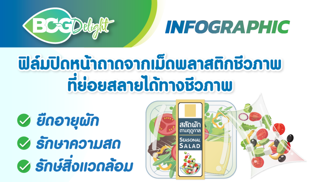 ศูนย์เทคโนโลยีโลหะและวัสดุแห่งชาติ (เอ็มเทค) สำนักงานพัฒนาวิทยาศาสตร์และเทคโนโลยีแห่งชาติ (สวทช.) ร่วมกับมูลนิธิโครงการหลวง และบริษัททานตะวันอุตสาหกรรม จำกัด (มหาชน) พัฒนาฟิล์มปิดหน้าถาดจากเม็ดพลาสติกชีวภาพที่ย่อยสลายได้ทางชีวภาพ โดยผลงานนี้โดดเด่นใน 3 ด้านหลัก คือ ฟิล์มบางใส ต้านทานการเกิดฝ้า ช่วยยืดอายุสินค้าผักสลัดให้คงสภาพสดใหม่ในชั้นวางจำหน่ายจากเดิม 3 วัน เป็น 5 วัน มูลนิธิโครงการหลวงได้นำร่องใช้ฟิล์มกับบรรจุภัณฑ์ ‘เมนูผักสลัดพร้อมทาน’ สำหรับจำหน่ายในร้านโครงการหลวงแล้ว ผลงานการวิจัยนี้ตอบโจทย์โมเดลเศรษฐกิจ BCG ทั้งด้านการสร้างมูลค่าเพิ่มให้กับสินค้าการเกษตร ทั้งในด้านการสร้างมูลค่าเพิ่ม ลดการสร้างของเสีย และเป็นมิตรกับสิ่งแวดล้อม ความสำเร็จของโครงการวิจัยนี้จะช่วยเพิ่มความสามารถในการผลิตให้แก่อุตสาหกรรมบรรจุภัณฑ์ พร้อมตอบโจทย์ความต้องการของตลาด นำไปสู่การเติบโตอย่างยั่งยืน ทั้งนี้การวิจัยและพัฒนานี้ได้รับการสนับสนุนงบประมาณจากคณะกรรมการส่งเสริมวิทยาศาสตร์ วิจัยและนวัตกรรม (สกสว.) รายละเอียดเพิ่มเติม: เอ็มเทค สวทช. เปิดตัว ‘ฟิล์มปิดหน้าถาดจากเม็ดพลาสติกชีวภาพที่ย่อยสลายได้ทางชีวภาพ’ ‘มูลนิธิโครงการหลวง’ นำร่องใช้จริงบรรจุเมนูผักสลัดพร้อมทาน ผู้บริโภคได้ 2 ต่อ ‘กินผักสดดีต่อสุขภาพ-หนุนบรรจุภัณฑ์เป็นมิตรต่อโลก’