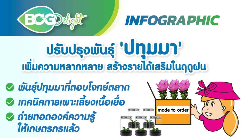 ปทุมมาเป็นไม้ดอกสวยงามที่มีถิ่นกำเนิดในประเทศไทย และมีมูลค่าการส่งออกสูงเป็นอันดับ 2 ของประเทศ สำนักงานพัฒนาวิทยาศาสตร์และเทคโนโลยีแห่งชาติ (สวทช.) จึงร่วมกับ หจก. ลักกี้ซีดส์อโกร สนับสนุนให้นักวิจัยศูนย์พันธุวิศวกรรมและเทคโนโลยีชีวภาพแห่งชาติ (ไบโอเทค) สวทช. ทำการพัฒนาพันธุ์ปทุมมา เพิ่มความหลากหลายของสายพันธุ์ และความทนทานต่อโรค เพื่อให้ได้สายพันธุ์ที่ตอบโจทย์ความต้องการของตลาด ทั้งตลาดดอกไม้สด ไม้กระถาง รวมถึงการทำแปลงไม้ดอกเพื่อจัดการท่องเที่ยว ปัจจุบันได้มีการขึ้นทะเบียนพันธุ์ใหม่และมีการนำไปใช้ประโยชน์แล้วรวม 19 พันธุ์ นอกจากการปรับปรุงพันธุ์เพื่อยกระดับมูลค่าทางเศรษฐกิจ ทั้ง 2 หน่วยงานยังได้ร่วมกันสนับสนุนการวิจัยและพัฒนาเทคนิคการเพาะเลี้ยงเนื้อเยื่อสำหรับขยายต้นพันธุ์ปลอดโรคที่ได้มาตรฐาน และสนับสนุนการนำองค์ความรู้เรื่องพันธุ์ใหม่และเทคนิคในการเพาะปลูกไปถ่ายทอดให้แก่เกษตรกร เพื่อเป็นช่องทางสร้างรายได้เสริมในช่วงฤดูฝนไปจนถึงฤดูหนาวอีกด้วย ตัวอย่างพันธุ์เด่นที่ได้จากการพัฒนา คือ ปทุมมาพันธุ์ “ห้วยสำราญ” ที่สถาบันการจัดการเทคโนโลยีและนวัตกรรมเกษตร (สท.) ได้นำองค์ความรู้และเทคนิคการเพาะปลูกไปถ่ายทอดให้แก่เกษตรกรชุมชนกลุ่มแปลงใหญ่ไม้ดอกไม้ประดับห้วยสำราญ-ห้วยเจริญ จ.อุดรธานี เพื่อร่วมพัฒนาแหล่งท่องเที่ยวเชิงเกษตร เกิดเป็นแหล่งสร้างรายได้เสริมใหม่ให้แก่คนในชุมชนเป็นที่เรียบร้อยแล้ว รายละเอียดเพิ่มเติม การรวบรวมและปรับปรุงพันธุ์ปทุมมาและกระเจียวพันธุ์ใหม่