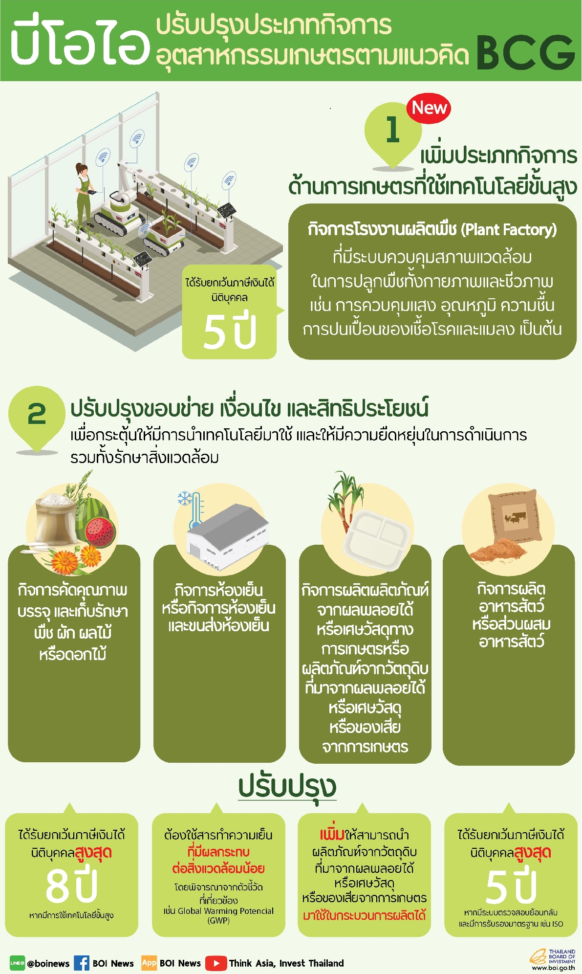 สำนักงานคณะกรรมการส่งเสริมการลงทุน (บีโอไอ) ให้การส่งเสริมการลงทุนในอุตสาหกรรมการเกษตรภายใต้แนวคิด BCG ด้วยการเพิ่มประเภทกิจการด้านการเกษตรที่ใช้เทคโนโลยีขั้นสูง ได้แก่ กิจการโรงงานผลิตพืช (Plant Factory) รวมถึงกิจการเดิมที่เกี่ยวข้องกับการทำการเกษตรที่มีการนำเทคโนโลยีและนวัตกรรมมาใช้ในกิจการและการรักษาสิ่งแวดล้อม